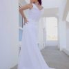 Elegante y fresco .Este delicado traje combina a la perfección su escote de cuello bote por el frente , pero con un desenlace hacia la parte trasera en forma V, y adornados con una fila de botones para acentuar sus detalles. Su falda en corte sirena y con una pequeña cola toman de protagonismo su simplicidad , decorada su cintura con cristales swarouski marcan un brillo sutil y elegante.