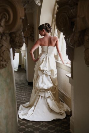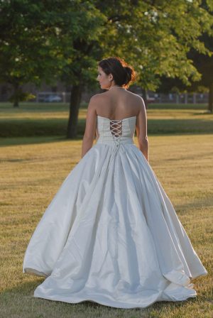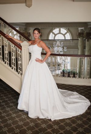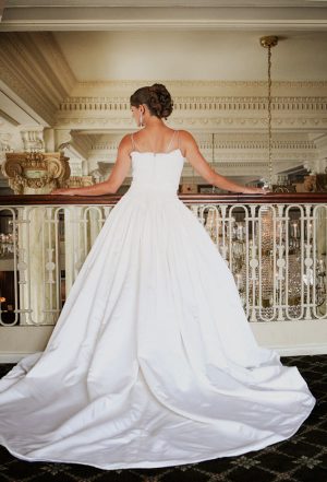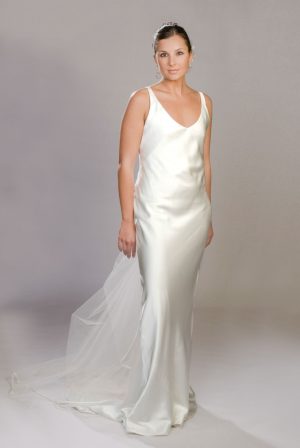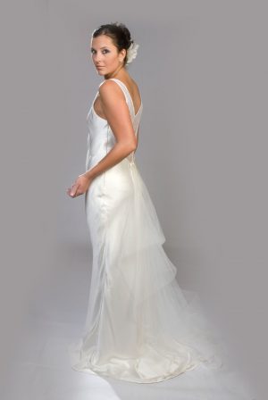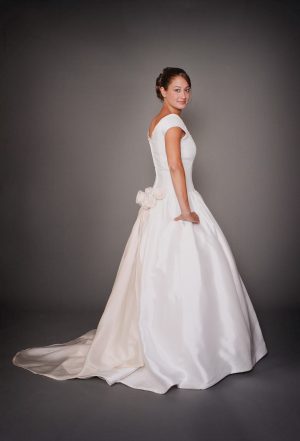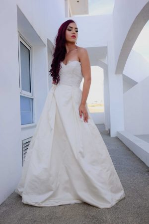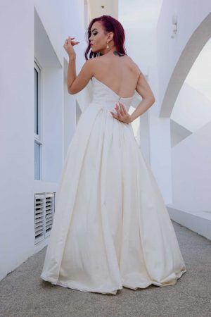 Hecho en seda cruda, corpiño acanalado, con una cola amplia con pliegues asimétricos, falda en “A”. disponible en colores crema y blanco hueso.