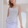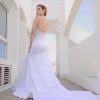 Diseñado en satín de seda natural color blanco, este traje combina detalles y elegancia. Destacando un hermoso escote strapless en forma de corazón, el corpiño está adornado con finas perlas de fantasía.  El corte tipo sirena y su cola de la corte completan esta hermosa pieza exclusiva Galap.