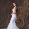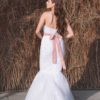 Corte sirena y escote recto. Drapeado con tulle y decorado con aplicaciones de algodón y pedrería son los elementos principales de este diseño. Su textura se contrasta entre lo plano y lo superficial al comparar entre el cuerpo y la parte de la falda. Ideal para una boda de destino, ya que su peso es muy leve. Puede llevar un cinturón de contraste de color pastel y adornado con piedras y brillos que resaltan y enriquecen su estilo en la línea de la cintura.