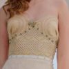 Sexy and flawless, a mix of fine and rustic fabrics with the star of this exclusive “Galap Dress” the shawl straw highlighted by a strapless neckline in the shape of a heart, adorned with applications of emeralds and golden threads. Her corset with a