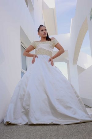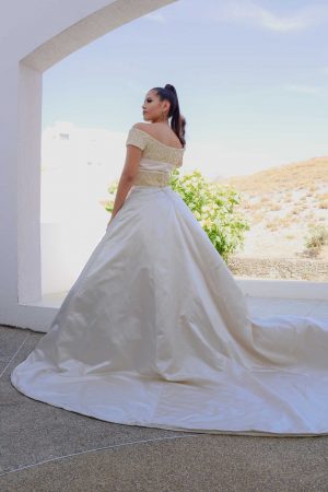 This design, however simple it may seem, should not deceive you, it was created taking care of every detail of its preparation, the result was a wedding dress that offers a perfect balance between simplicity and romanticism, it will make our bride look a delicate silhouette, Ideal for the romantic bride who lets the simple yet elegant be the calling card on her wedding day. Made in silk charmeuse, empire cut, adorned at the top with a French embroidered lace and held with straps that give a sexy touch. Available in cream and off-white colors.