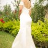 Italian silk, this beautiful suit highlights the shoulders in small short sleeves that continue in a beautifully draped bodice. The natural waist frames the mermaid-like silhouette that opens into an “A” line skirt culminating in a delicate sweep train